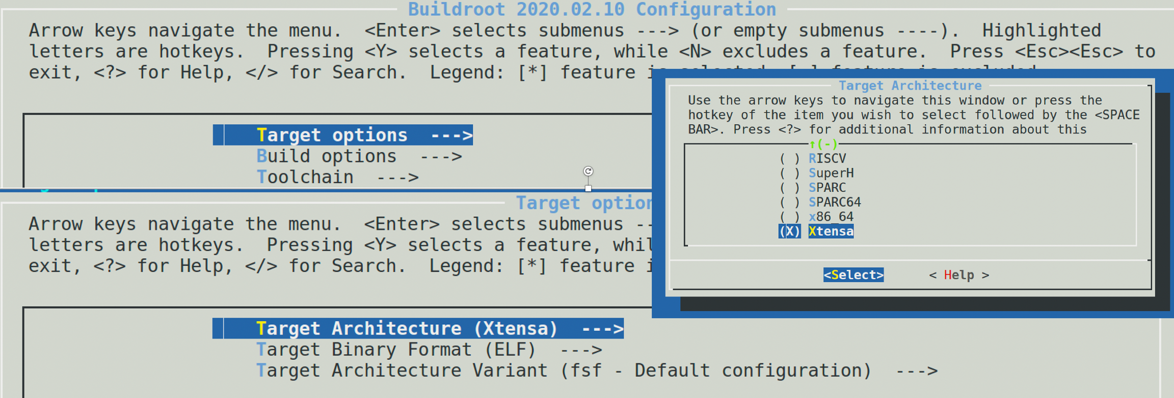 简单的来说他能构建出一个完整的能运行在目标嵌入式设备上的系统,所以最终成品是内核以及文件系统,因此在构建系统的时候也必然需要会构建编译工具。我们我们通过buildroot获得交叉编译工具,其实是需要他的副产品。buildroot提供了图形化的编译界面,对于我们的需求:只要交叉编译工具来说,make menuconfig中选择目标架构以及配套的C库,然后编译即可。我们尝试做一个xtensa的交叉编译器: