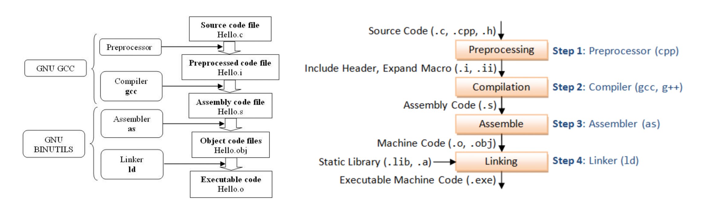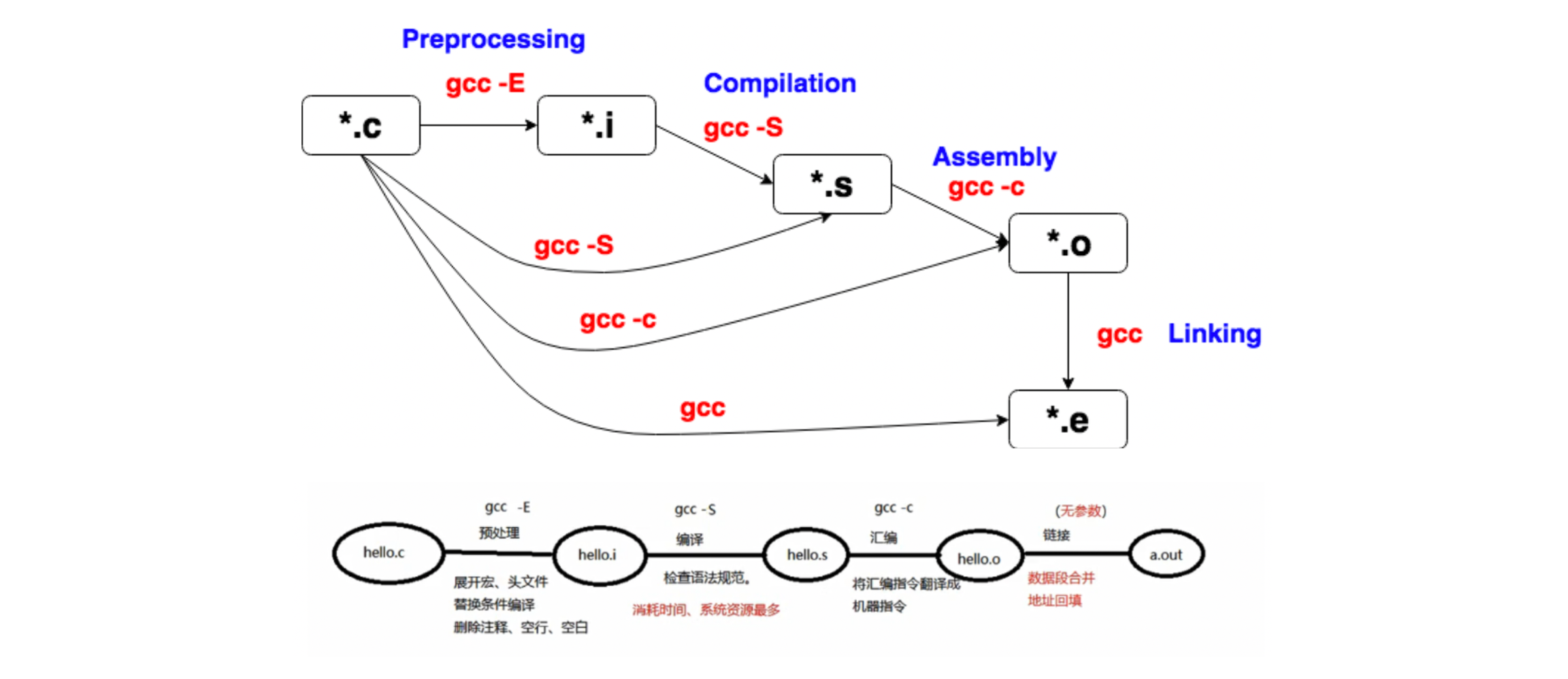 gcc version 8.4.0 (Buildroot 2020.02.10) 所以能交叉编译的道理是gcc本身支持,并不是交叉编译工具都是单独的源码,他就是gcc。这个你熟悉的不能再熟悉的软件,但,你真的足够了解他么?编译器是一个非常复杂的软件,他可以将你的源码变成一个可以运行在目标系统上程序。如果我们这里就限定,目标就是linux用户态程序,那么编译器就是根据你的源码,做一个相应的ELF文件出来,这个过程非常复杂。以下这种图是在学习C语言开篇时非常常见: