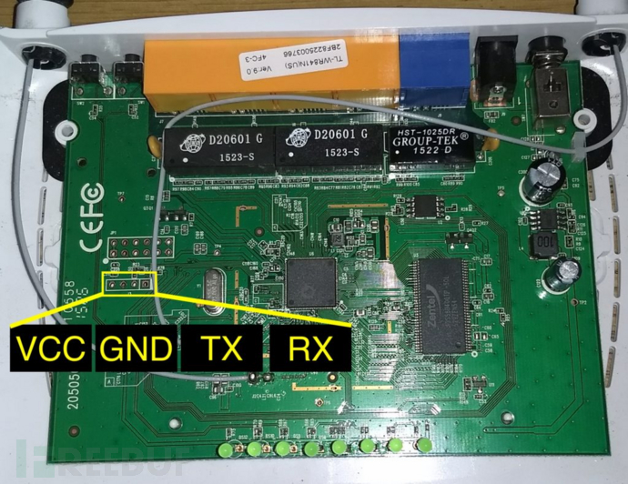 UART接口在物理设备的电路板上,一般是一个拥有3/4个针脚的面板。在我们的分析场景中(TP-Link WR841N v9.0),端口情况如下图所示:
