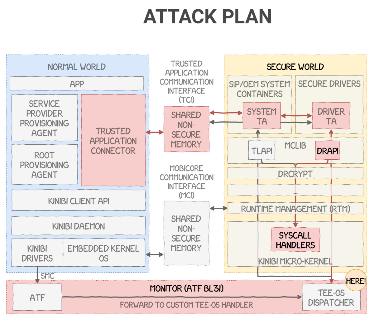 然后他们发现这个 Secure Service 的其中一个 System Call 是一个任意地址 mmap,而且没有任何限制。于是他们可以直接把 Secure Monitor 的物理地址直接 mmap 到 Secure Service 的虚拟地址空间,然后直接改写 Secure Monitor 的代码,直接拿到 Secure Monitor 所在的 Secure World EL3 权限。基本上来说,拿到 EL3 权限,就已经可以做到任何想做的事情了。